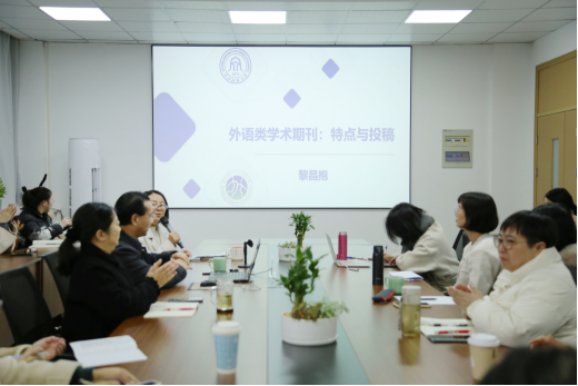 黎昌抱从外语期刊概要特点、国际(海外)学术期刊概要、外语学术期刊现状趋势、学术期刊功能与投稿建议等方面分享了投稿流程,并结合自身经历,分享了基于教学进行科研的经验,他指出教师应从教学实践中挖掘研究选题,不断提高科研能力。黎昌抱还与参会教师互动,回答了师生提问。