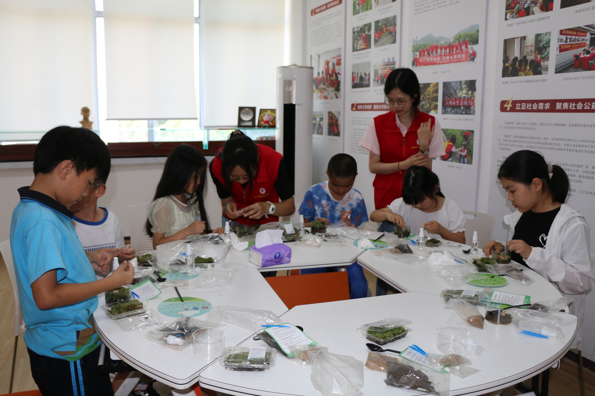此外,为让孩子们在欢乐中深化对生态环保知识的理解,实践团以制作生态瓶为载体,让孩子与家长在实践中感受生态之美。活动现场,孩子们热情高涨,围坐聆听小老师讲解生态瓶制作方法和养护知识后,便动手实践。在实践团成员的帮助与相互配合下,大家根据自己的喜好仔细挑选出五彩斑斓的小石子、生机盎然的多肉等材料,将精心挑选的材料小心翼翼放入生态瓶中,构筑出一个个精巧别致的微型生态系统。此次活动不仅锻炼了孩子们的动手能力和团队协作能力,更让他们深刻体会到保护生态环境的重要性。孩子们表示,非常喜欢这个活动,也通过活动更明白了生态平衡的意义,愿意为保护环境贡献自己的一份力量。活动尾声,孩子们手捧着亲手制作的生态瓶,与实践团成员一同合影,他们纯真的笑容里,悄然蕴藏着成为生态卫士的梦想萌芽。