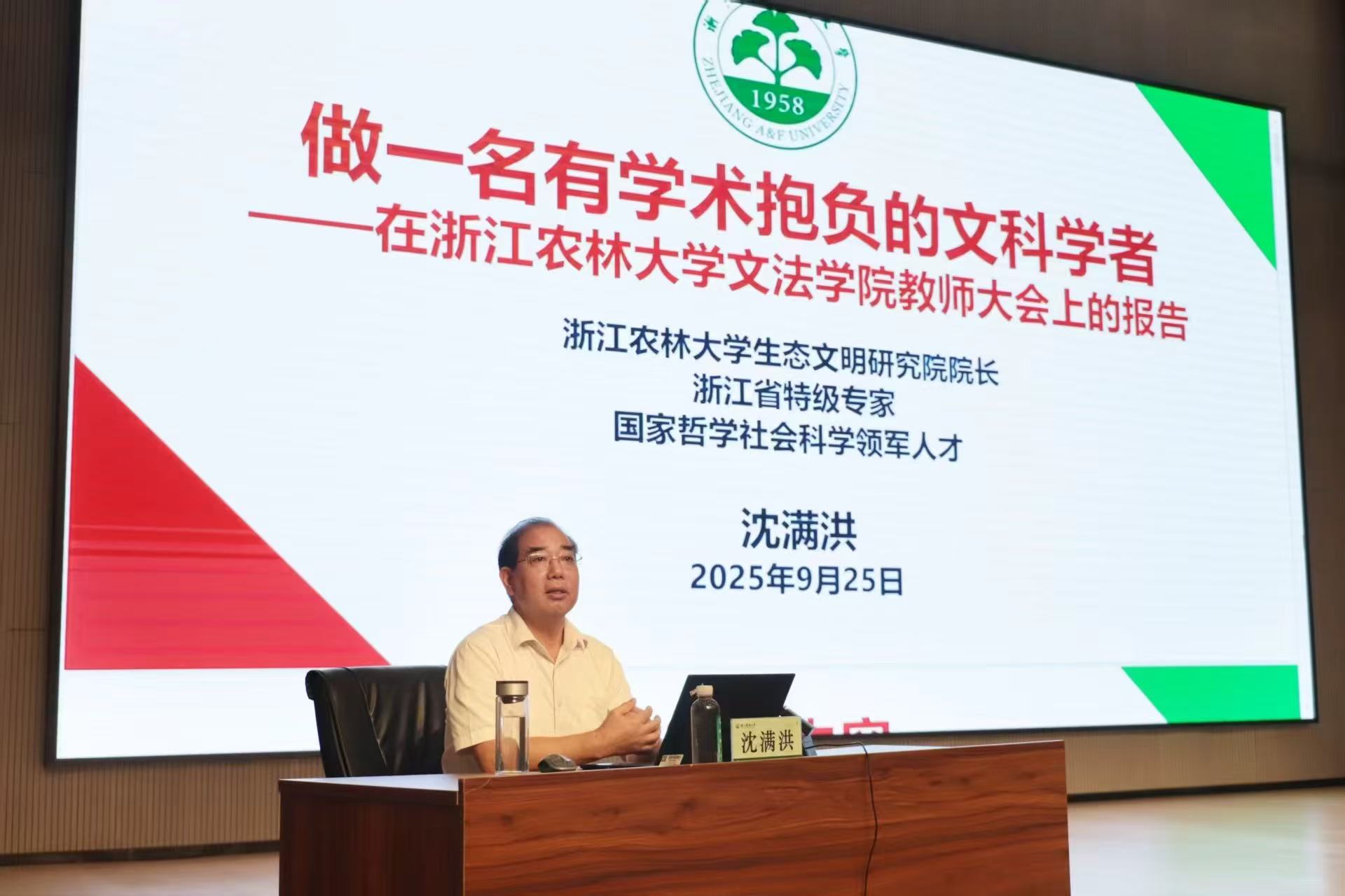 会议特邀学校原党委书记、ok138cn太阳集团生态文明研究院院长沈满洪教授,面向全院教职工作《做一名有学术抱负的文科学者》辅导报告,他分享了自己在文科科研道路上攻坚克难的宝贵经验与体悟,激励文法教师在文科科研进步的道路上不断勇攀高峰。