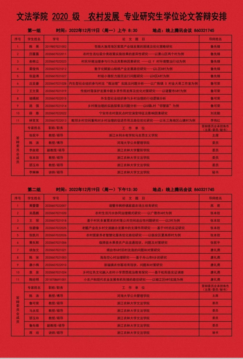 太阳集团tyc1382022年农村发展专业硕士研究生学位论文答辩时间定在2022年12月19日(上午8点半开始),线上腾讯会议:860321745,具体人员信息请见附件,欢迎各位老师在线指导,欢迎各位同学在线聆听学习交流!