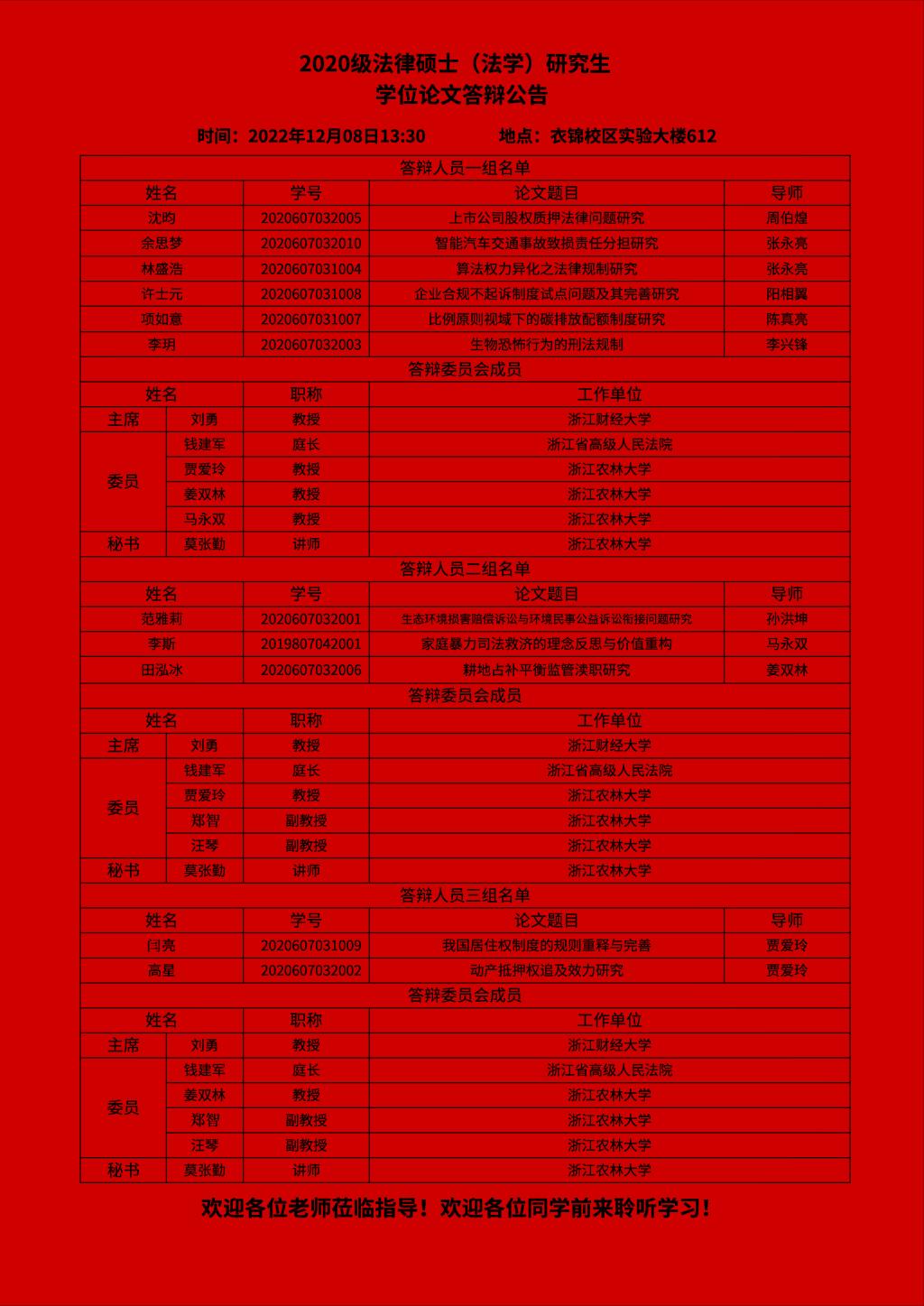 太阳集团tyc1382022年法律法学专业硕士研究生学位论文答辩时间定在2022年12月8日(下午1点半开始),衣锦校区实验大楼612,具体人员信息请见附件,欢迎各位老师莅临指导,欢迎各位同学前来聆听学习交流!
