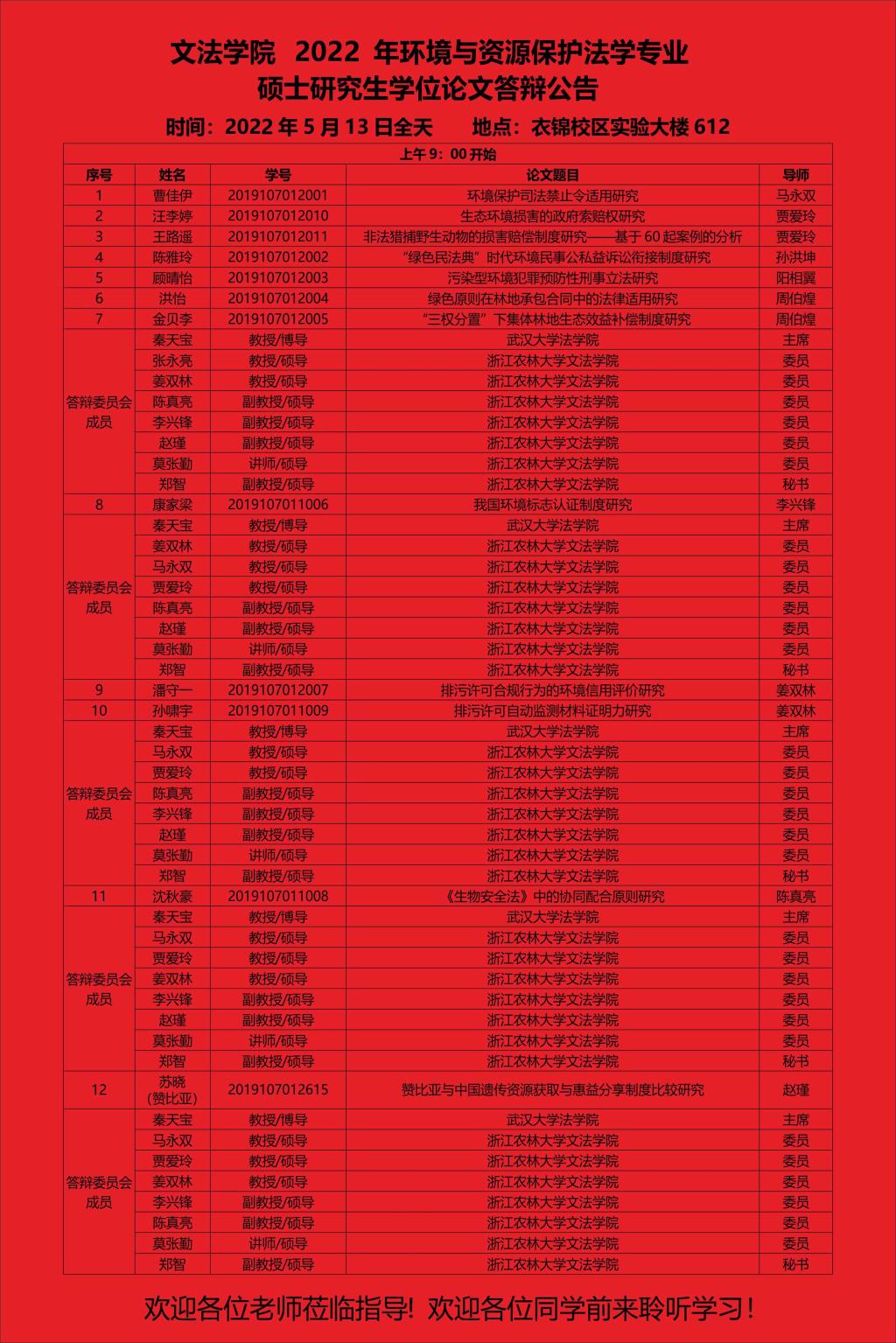 太阳集团tyc1382022年环境与资源保护法学专业硕士研究生学位论文答辩时间定在2022年5月13日(上午9点开始),衣锦校区实验大楼612,具体人员信息请见附件,欢迎各位老师莅临指导,欢迎各位同学前来聆听学习交流!