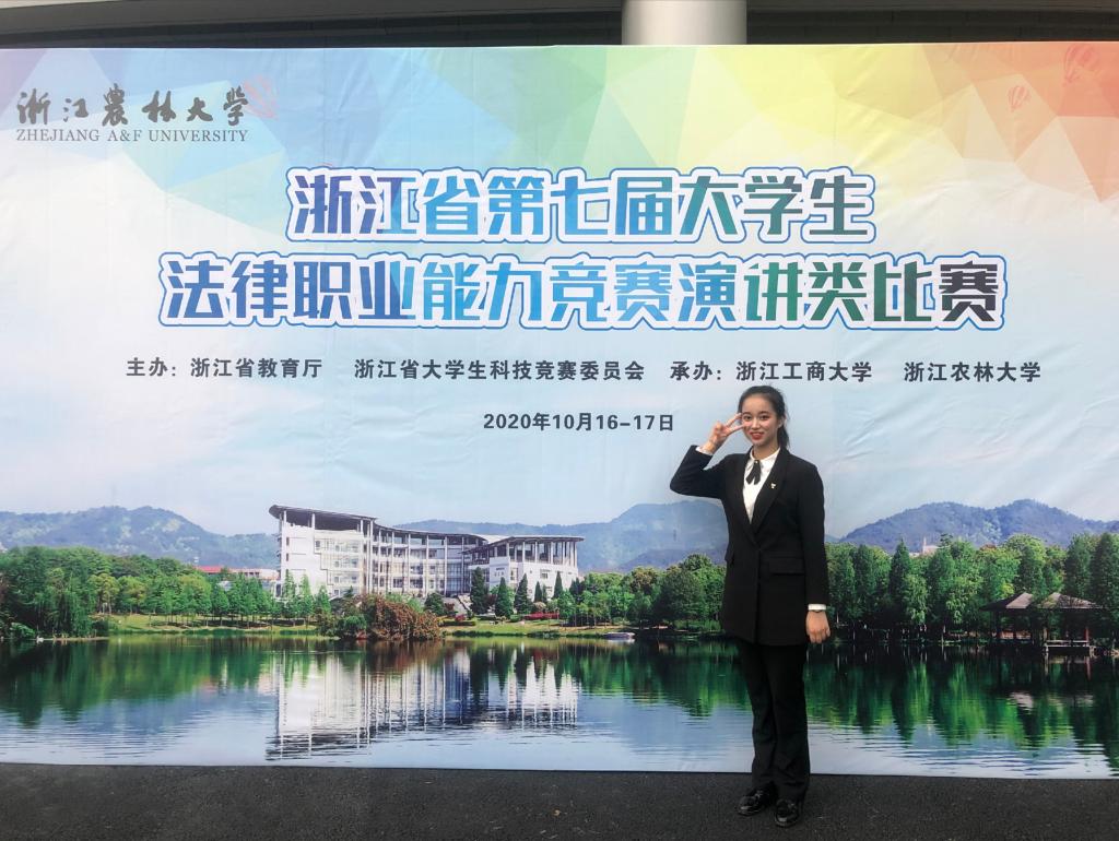 在成长的过程中,她也曾有过碰壁和犹疑。谈及学科竞赛,她印象最深的是浙江省法律职业能力大赛的筹备。备赛流程枯燥且漫长,团学工作的冲突和学业的繁重,对她的精力是一个极大的挑战。因为有了老师的指导与伙伴的鼓励,她并没有因此而失去信心,而是更加认真地打磨演讲稿。决赛前半个月,为了能够取得更好的成绩,舒一诺开始了三点一线的备赛生活,每晚都练习到快要门禁才回去休息。正是这一遍又一遍的练习,使她为比赛做足了准备,最终在决赛中展现出真实水平,斩获浙江省法律职业能力竞赛演讲类一等奖。