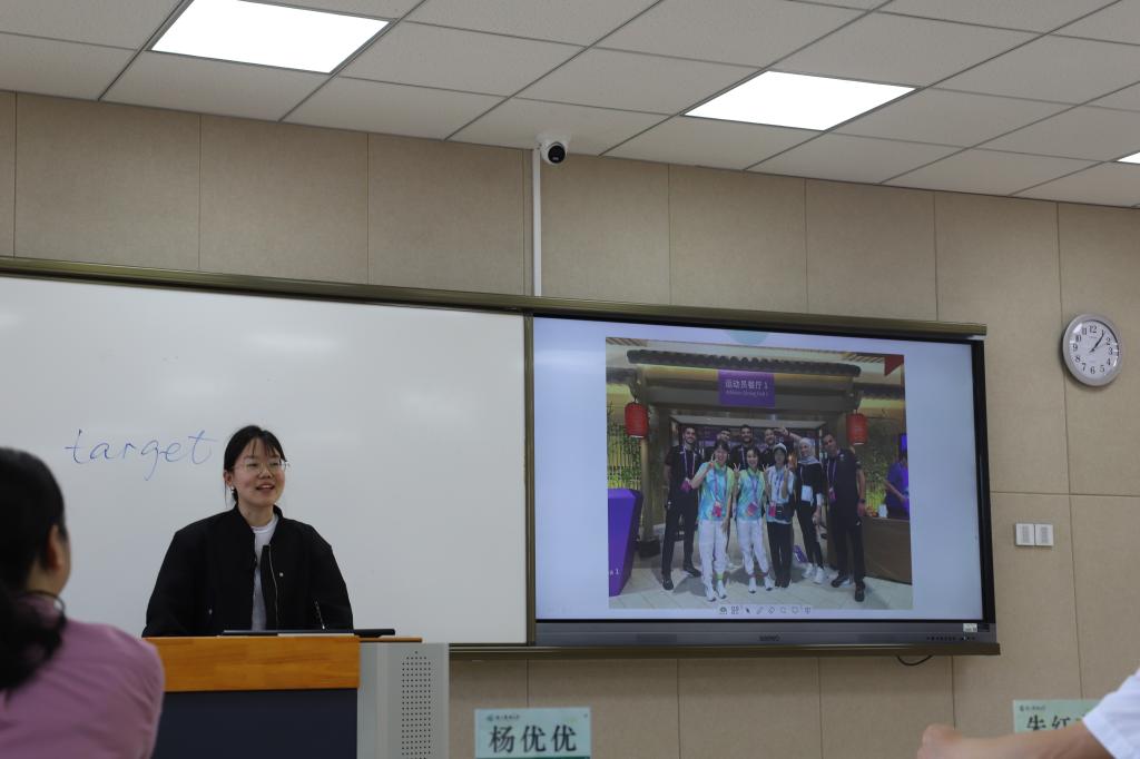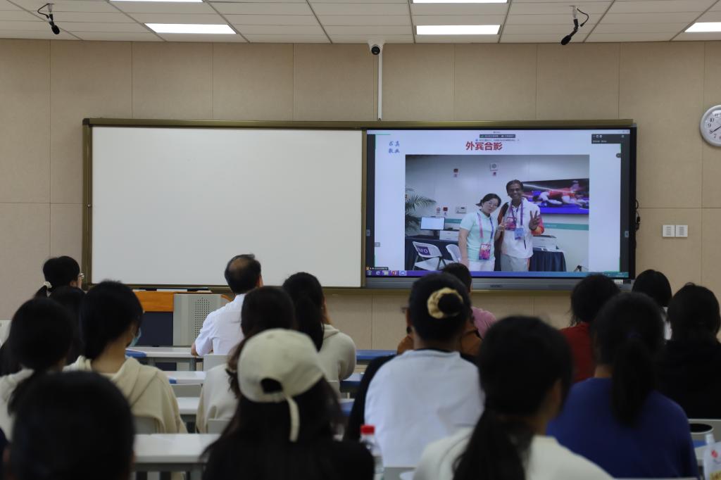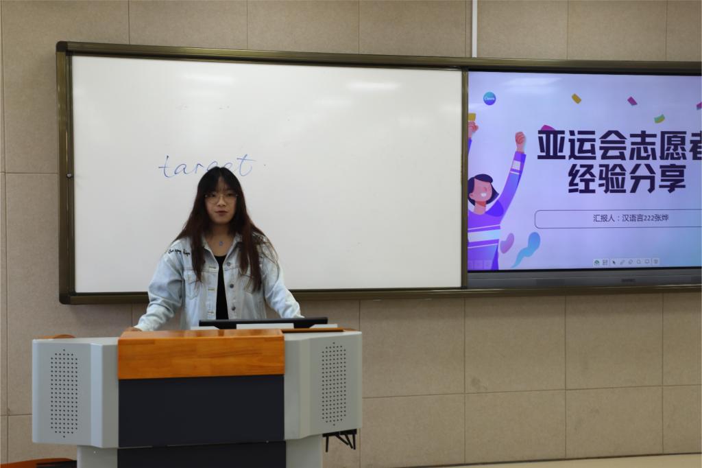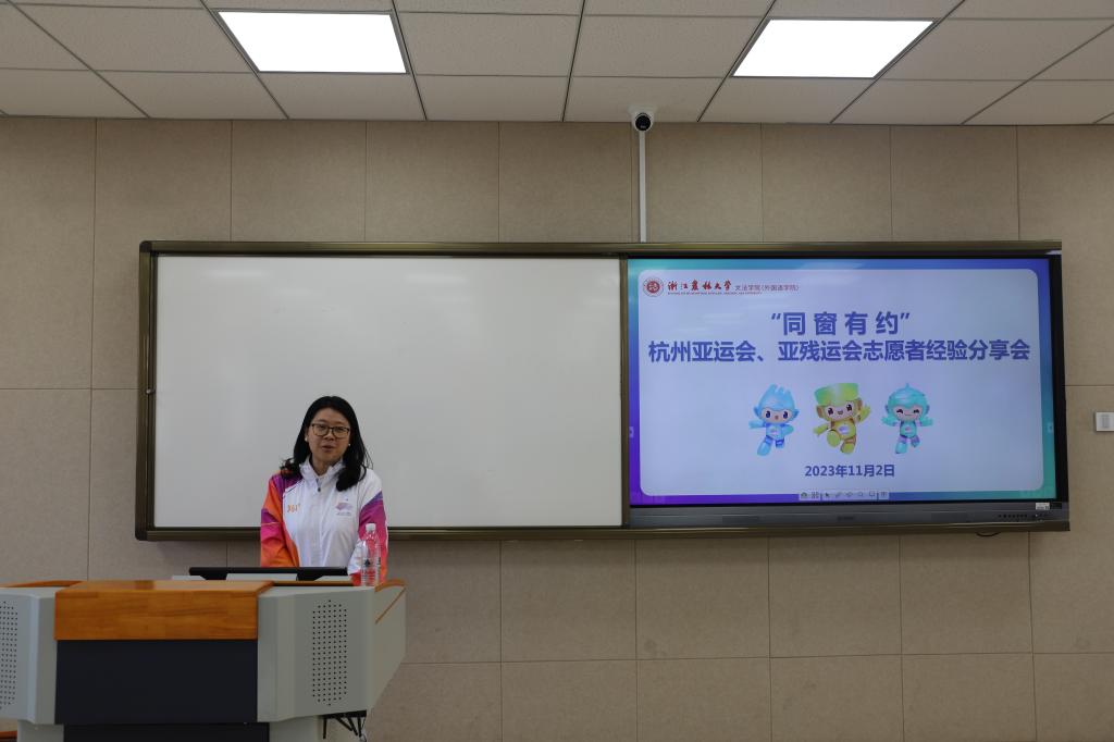 周庆玲老师线上分享杭州亚运志愿者们工作的具体情况。她认为参加亚运会这样的大型国际赛事使她获得了非常宝贵的感受和体验,感觉到了自己责任的重大。赵琳秀老师分享了她在杭州亚残运会的经历,并指出要摆正服务姿态,更要有责任心,英语学无止境,希望同学们在未来不断探索。
