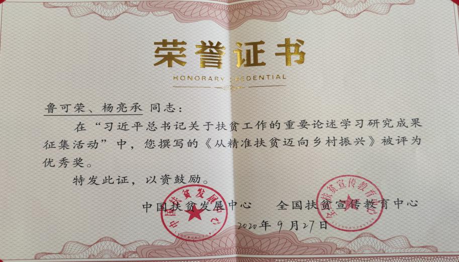 2020年是脱贫攻坚收官之年。为了深入学习贯彻研究习近平总书记关于扶贫工作的重要论述,助力高质量打赢脱贫攻坚战,2020年9月27日在北京会议中心举办习近平扶贫论述成果征集交流研讨会。此次活动由国务院扶贫办中国扶贫发展中心、全国扶贫宣传教育中心和西安交通大学联合主办,西安交通大学马克思主义学院和中国西部贫困治理研究中心承办。研讨会首先公布了“习近平扶贫重要论述研究成果获奖”名单,并为获奖代表颁奖。太阳集团tyc138鲁可荣教授团队2019年出版的著作《从精准扶贫迈向乡村振兴》获得优秀成果奖。